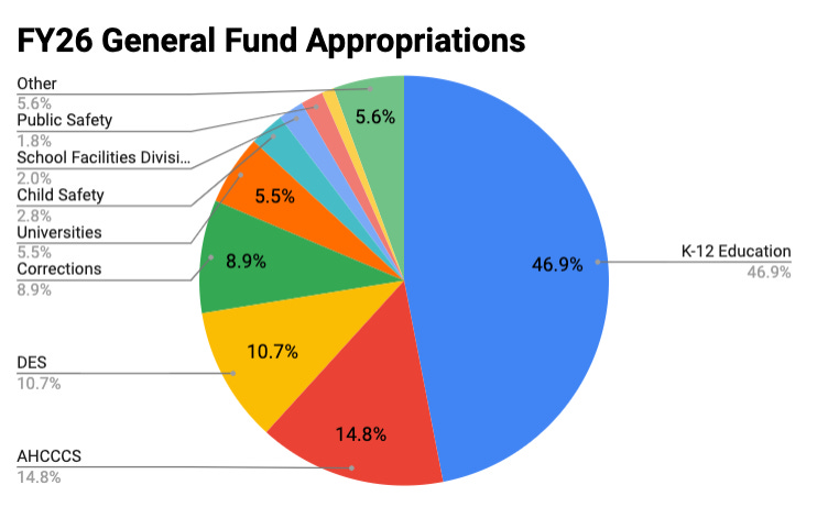 The FY26 budget that passed this year, for example, allocated $17.6 billion in General Fund spending. Three departments — Education, AHCCCS and Economic Security — received more than 70% of it.