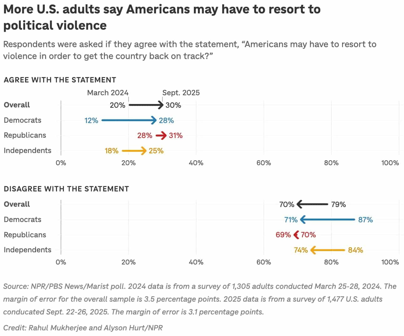 NPR found that three in 10 Americans now believe we may have to resort to violence to get the country back on track. The number of those thinking we need to go to blows is up 11 percentage points since April of last year, and it increased after a recent string of political violence, including the death of Charlie Kirk.