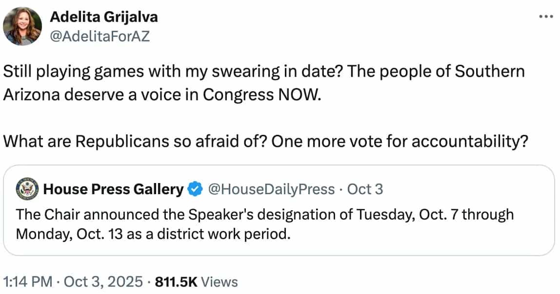 Promises mean nothing these days: Republican House Speaker Mike Johnson is taking back his vow to swear in Congresswoman Adelita Grijalva next week, Wayne Schutsky reports for KJZZ. A day after Johnson said he would “immediately” swear in Grijalva when lawmakers returned to Congress, he designated the next week as a district work period — meaning the House will not be in session. Democrats have criticized the delay and questioned whether he’s doing it to prevent the release of the Jeffrey Epstein investigation files.