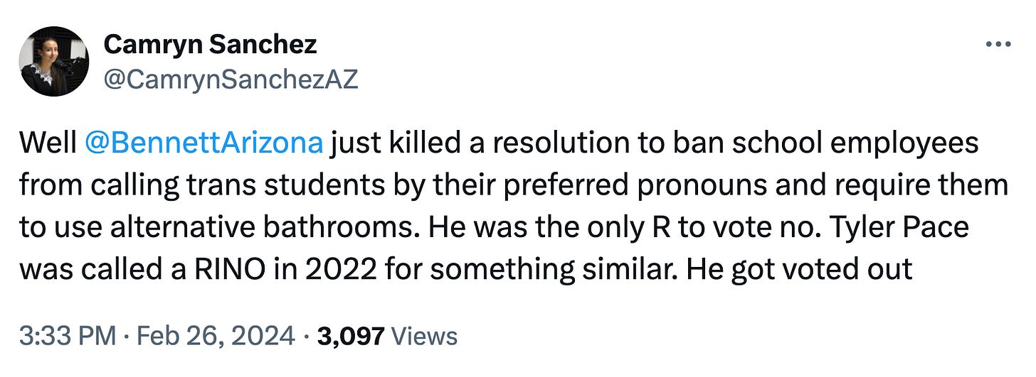 Bills need a simple majority: House and Senate Republicans have been busy approving several election-altering bills, like a measure that would discount the result of bond elections that less than 60% of voters cast a ballot for and another banning artificial intelligence for signature verification and ballot tabulating, which elections official don’t currently use, the Arizona Mirror’s Caitlin Sievers reports. The bills are bound for Gov. Katie Hobbs’ veto stamp, especially Sen. Jake Hoffman’s SB1286, which would ban non-precinct-based voting centers and make public and charter schools close to students on Election Day.