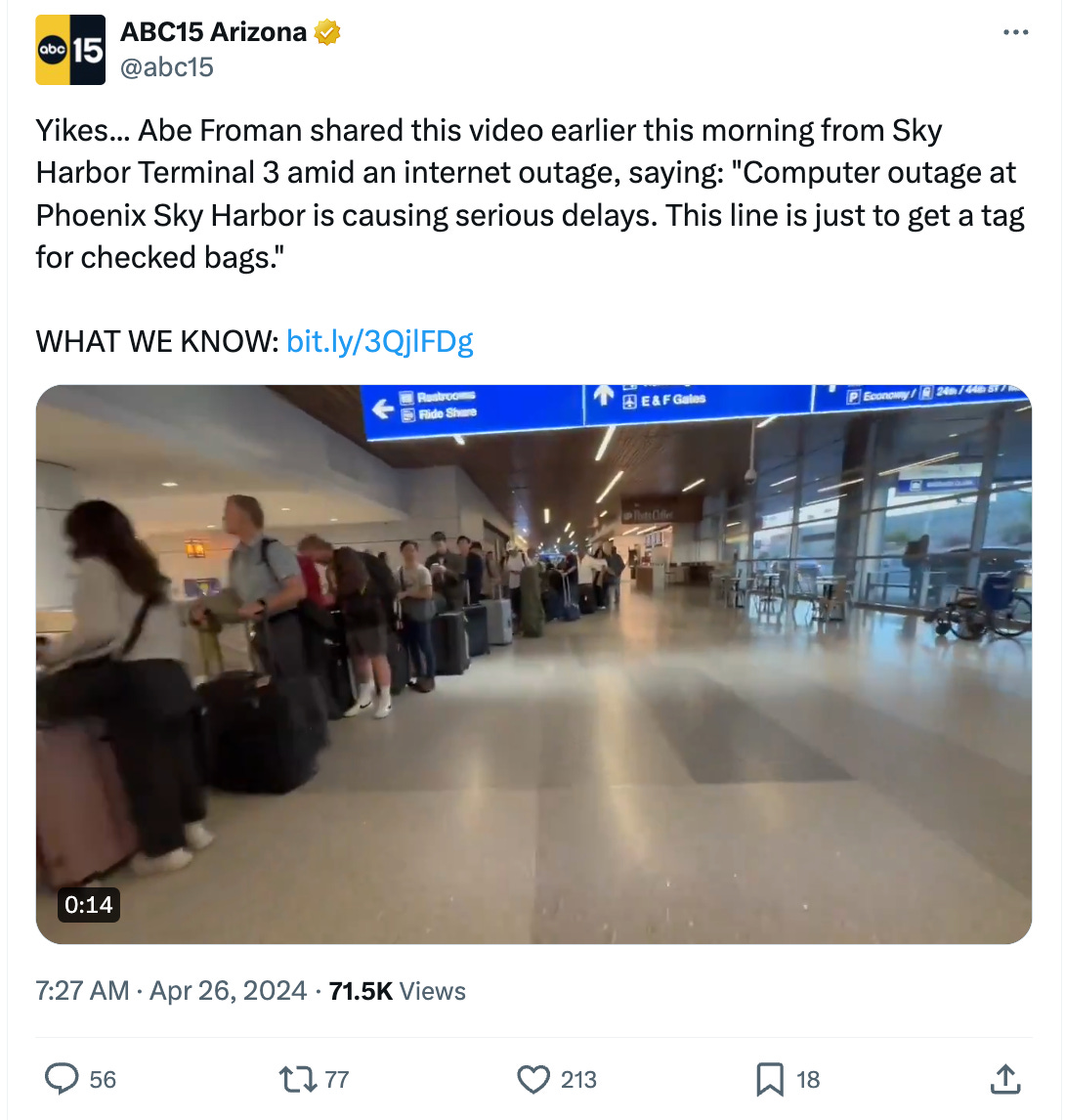 Sky Harbor experienced an internet outage Friday that caused delays and ridiculously long lines.