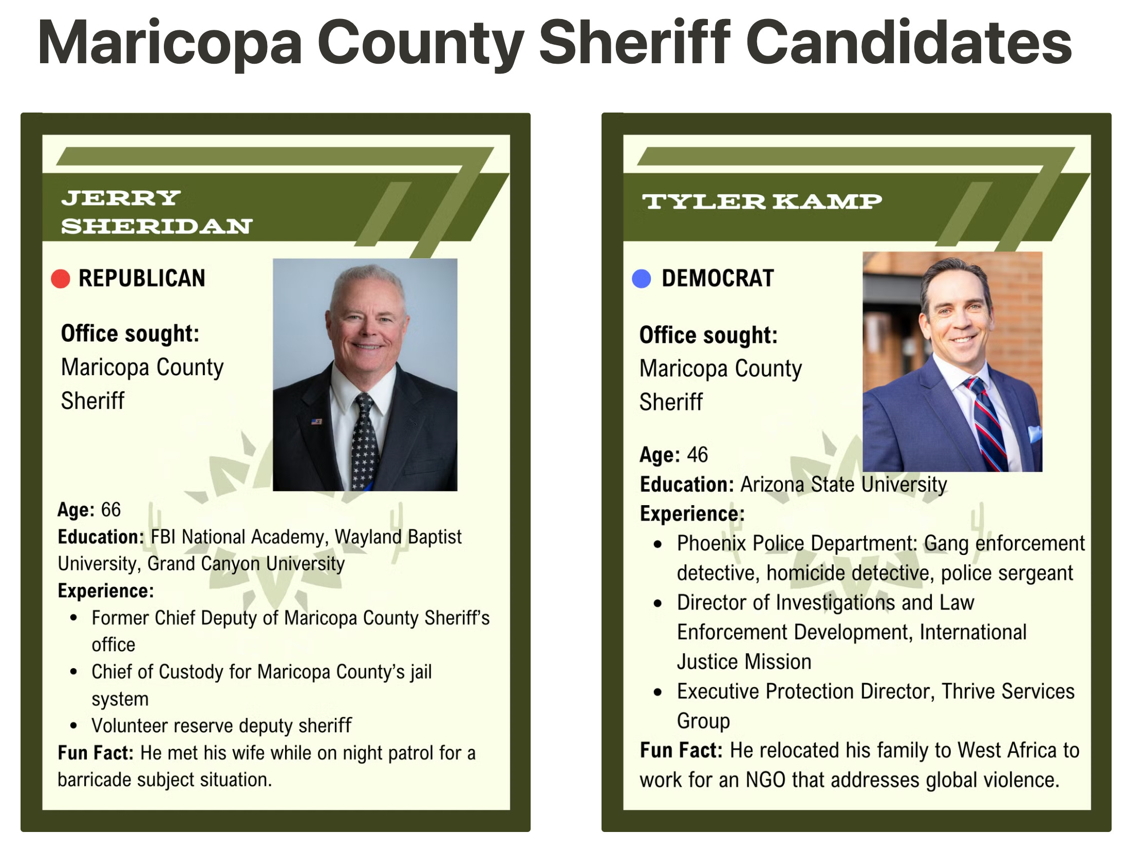 For Kamp, who spent more than 20 years in the Phoenix Police Department in roles like gang enforcement and homicide detective, his opponent Jerry Sheridan can’t be trusted. Sheridan was second-in-command during former Sheriff Joe Arpaio's embattled 24-year tenure when a federal court found the office racially profiled Hispanic people in traffic stops and required federal monitoring. Like Arpaio, Sheridan was held in contempt in the racial profiling lawsuit.