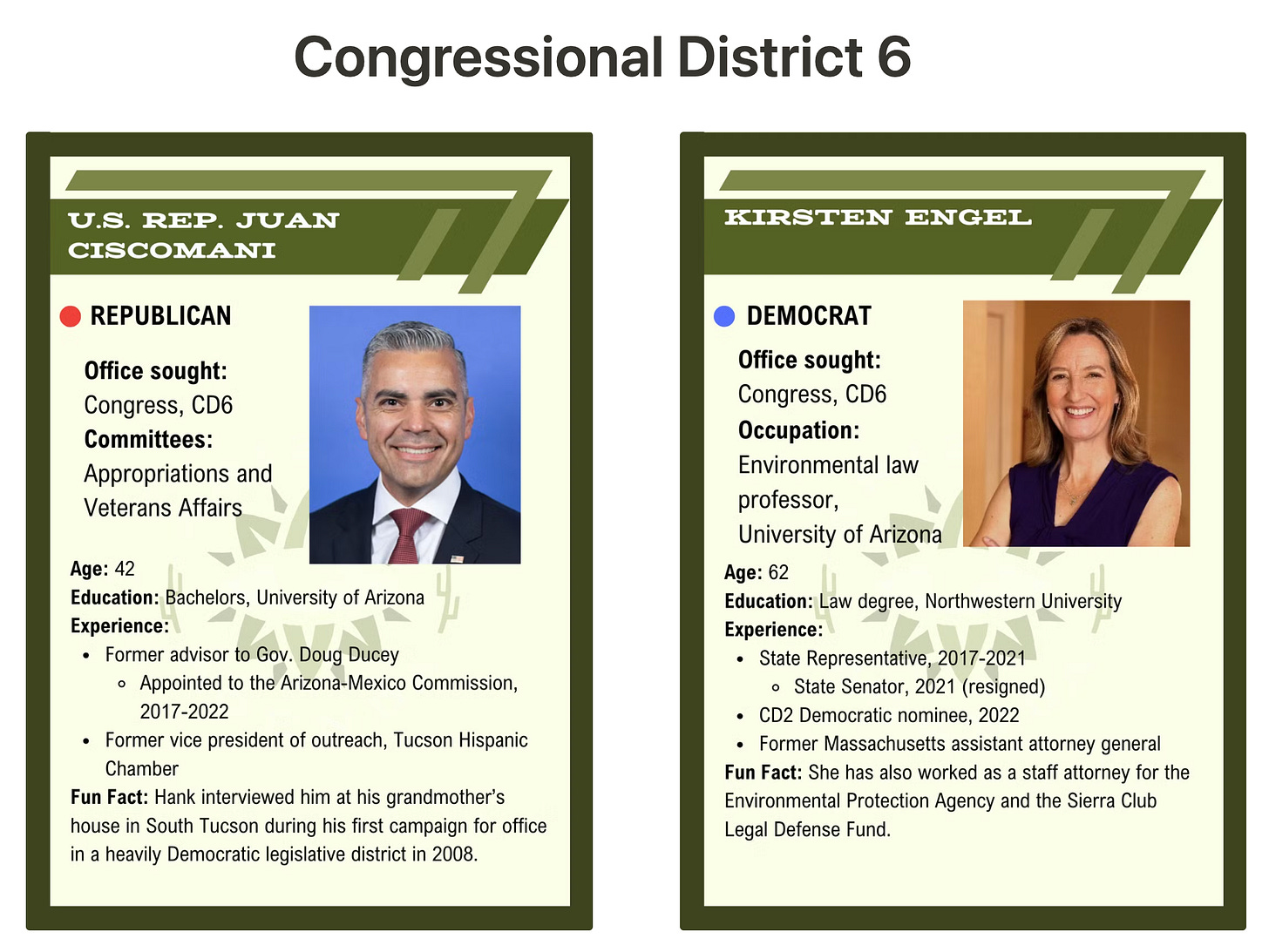 This year’s match is actually a rematch — Republican U.S. Rep. Juan Ciscomani is once again facing Democratic former lawmaker Kirsten Engel, who lost the 2022 race by fewer than 6,000 votes. And rematches have a history of working here — it took Martha McSally two tries to win this east Tucson-based district.