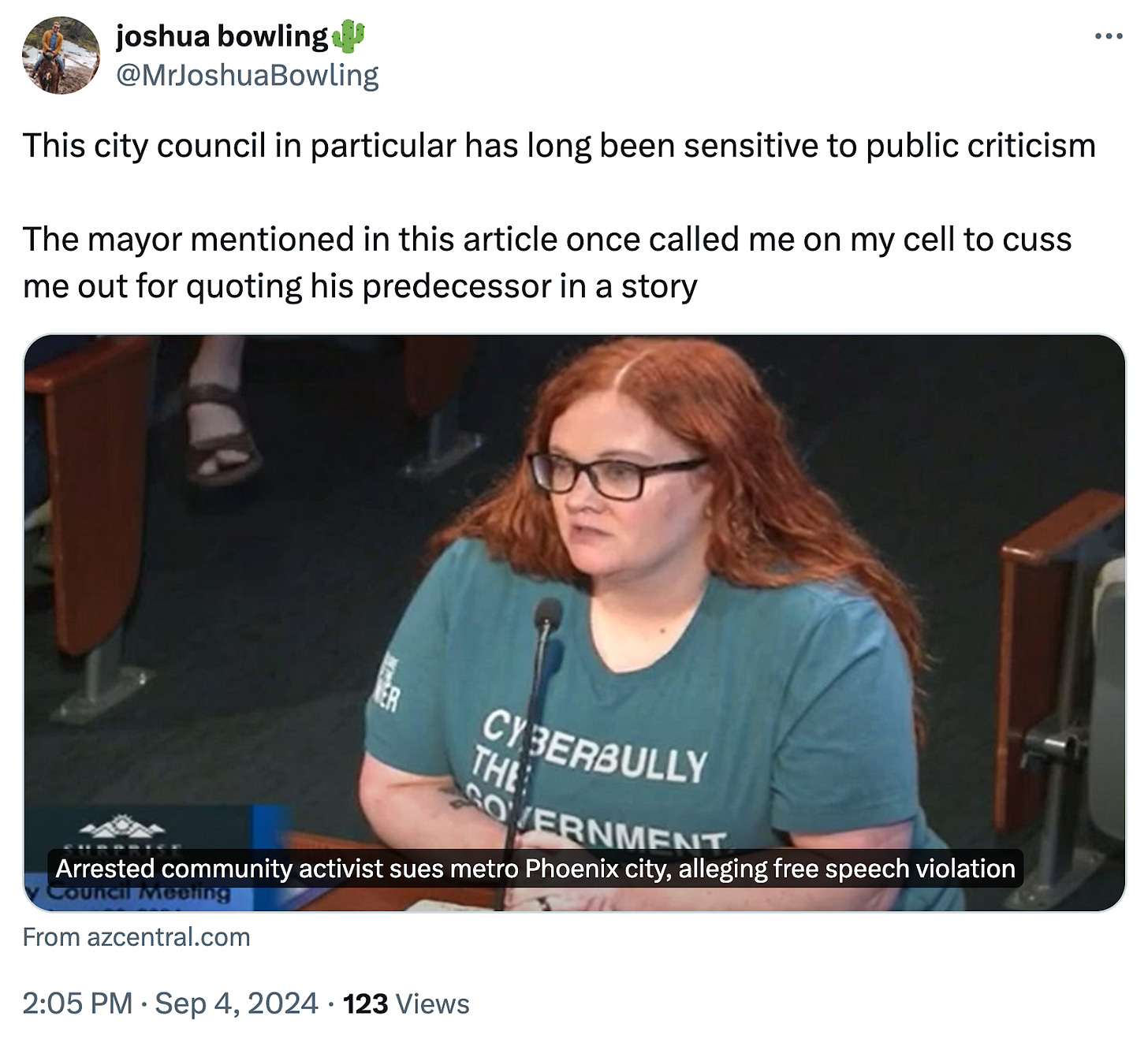 Speech isn’t free: The woman arrested at a Surprise City Council meeting last month for criticizing the city attorney filed a 42-page complaint with other residents and free speech groups to challenge Surprise’s policy of banning complaints about city employees during public comments, per the Republic’s Shawn Raymundo. It also accuses the city and officer who arrested Rebekah Massie of Fourth and 14th Amendment violations.