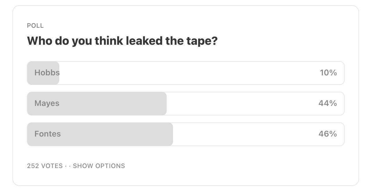 Thanks to the more than 250 readers who responded to yesterday’s poll asking which office most likely leaked the embarrassing tape of Arizona’s three top elected officials losing their shit over the voter registration glitch.
