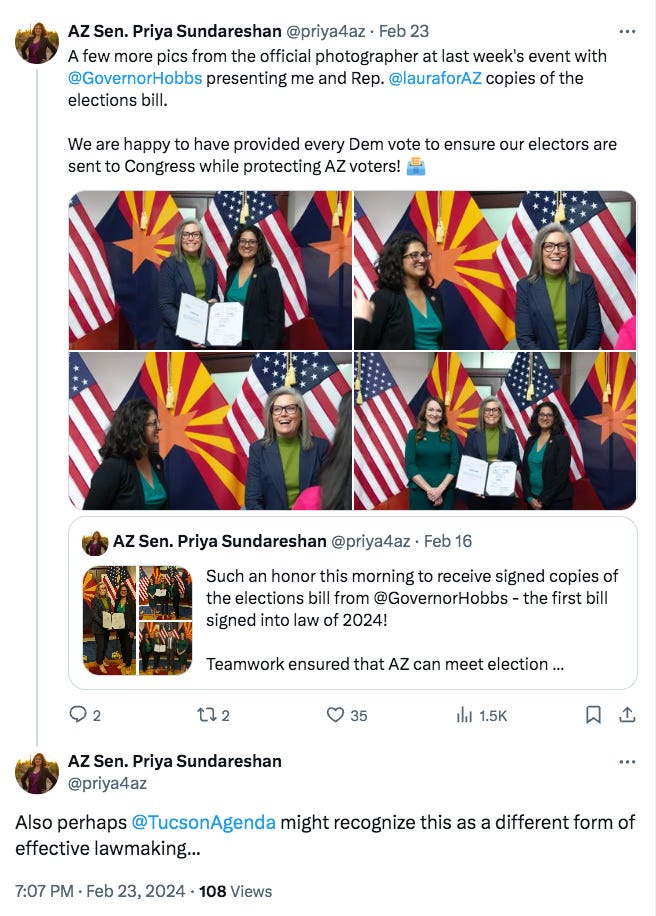 Although her name wasn’t on the bill that Gov. Katie Hobbs eventually signed into law, Sundareshan and her Democratic colleagues convinced Republicans to amend some of the worst provisions out of it. At the top of the list was getting rid of provisions from Sen. Wendy Rogers that were “irrelevant” or “disenfranchised voters.”