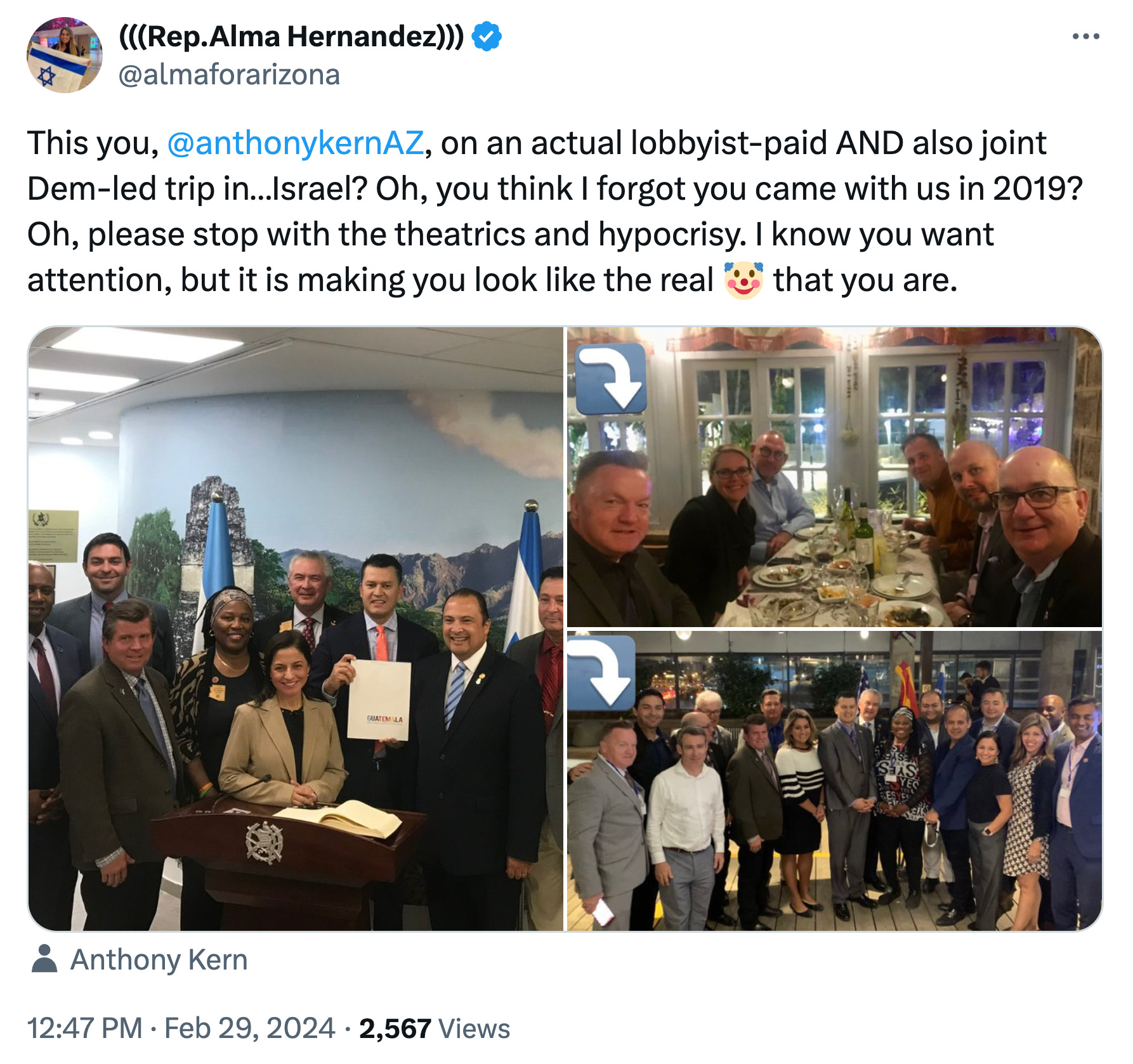 I wish you guys would quit fawning over the corporate zionist Alma Hernandez who regularly uses her platform to put forth red-meat legislation (for Republicans) that tries to ban pro-palestinian thought or action of any kind. Really, who needs the first Amendment anyway? Her latest action was an Instagram post, liked by AZdems ( i thought i was one but this “like” sure doesnt reflect MY thoughts) where she claims to have been so afraid of protesters outside a talk by Jill Biden that she needed a police escort out the back door. As one of those protesters, i cannot imagine how her fear allowed her to be seen in the front, right by us, schmoozing with others who were leaving the venue. Not the first time her “ facts and fears” need to be checked as she regularly posts nasty garbage about anyone who dares to challenge her uber Zionism. The junket is an obvious attempt to get more lawmakers to help her outlaw the first amendment for those of us who think that genocide is a bad thing. It invites foreign intervention into our politics as can be seen by numerous international and national laws that we regularly break in order to pleasure Israel in its relentless brutality. In our state it results in loyalty oaths to Israel and other assaults on freedom of speech or association. Her own LD passed a ceasefire resolution back in November, so don’t be thinking that she is representing US with all of her work on this score, no matter what her title is.