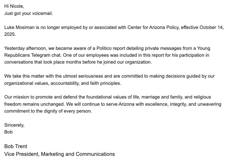 The Lord works in leaked chats: Luke Mosiman, chair of the Arizona Young Republicans and one of several members whose messages appeared in the super racist Young Republican group chat that was leaked to Politico, was fired Tuesday from his job at the Center for Arizona Policy, an evangelical lobbying group behind many of the anti-gay or anti-trans bills at the state Capitol. Bob Trent, CAP’s Marketing and Communications Vice President, told us that CAP learned about the leaked texts on Tuesday afternoon, and that “(Mosiman’s) participation in conversations … took place months before he joined our organization.” In the leaked group chat, Mosiman called for the rape of Hayden Padgett, the chair of the Young Republican National Federation. He also suggested “releasing Nazi edits” as an attack against a candidate, then quipped: “The only problem is we will lose the Kansas delegation.”
