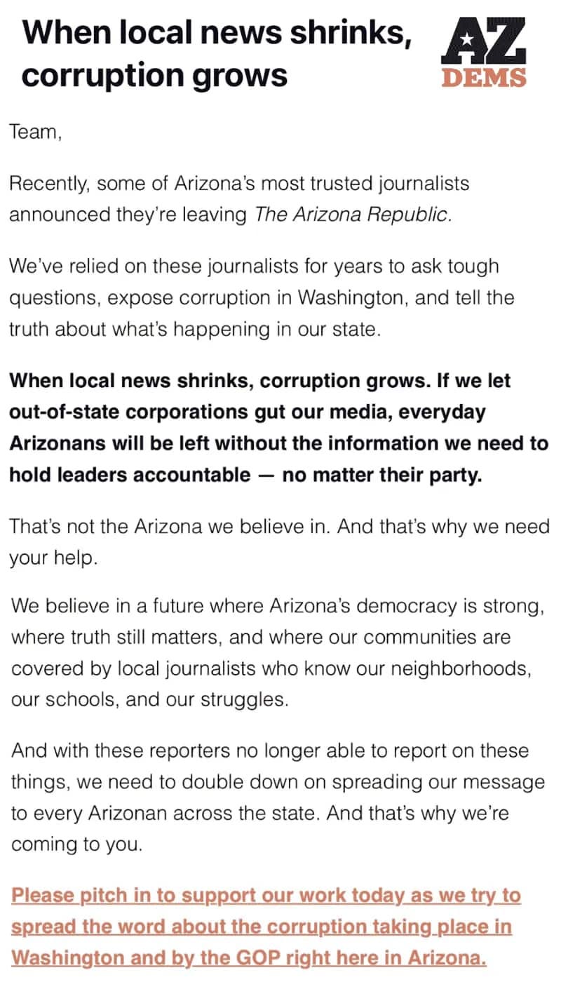 But the Arizona Democratic Party pretending that donating to them will help fill the gaps in the decimated local press corps is some of the most crass bullshit we’ve ever seen.