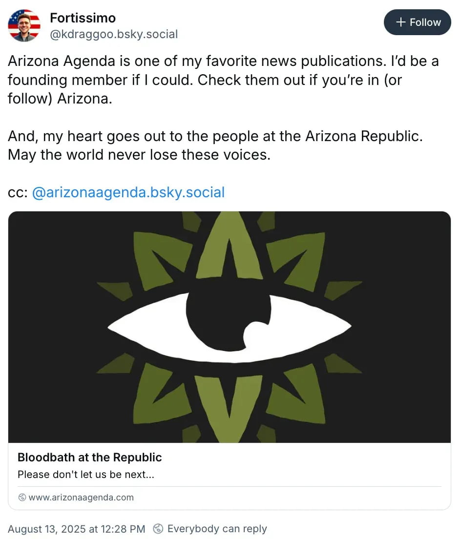 Even Attorney General Kris Mayes, a former Republic reporter herself, put out a statement denouncing the move as “bad news for democracy.”