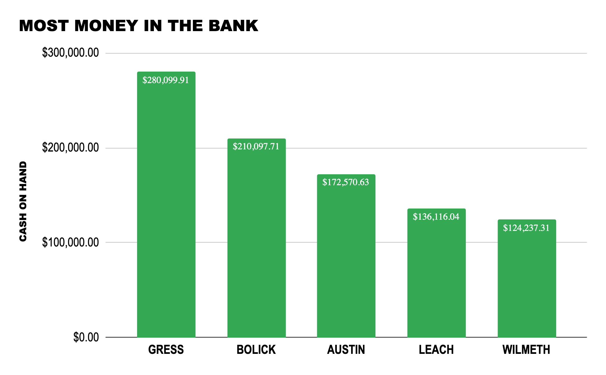 Four out of five candidates with the most cash on hand to fuel that final stretch are Republicans, including LD2 Sen. Shawnna Bolick, LD17 Senate candidate Vince Leach and LD2 House candidate Justin Wilmeth. Rep. Lorena Austin, who is seeking reelection in LD9, is the only Democrat who made the top five.