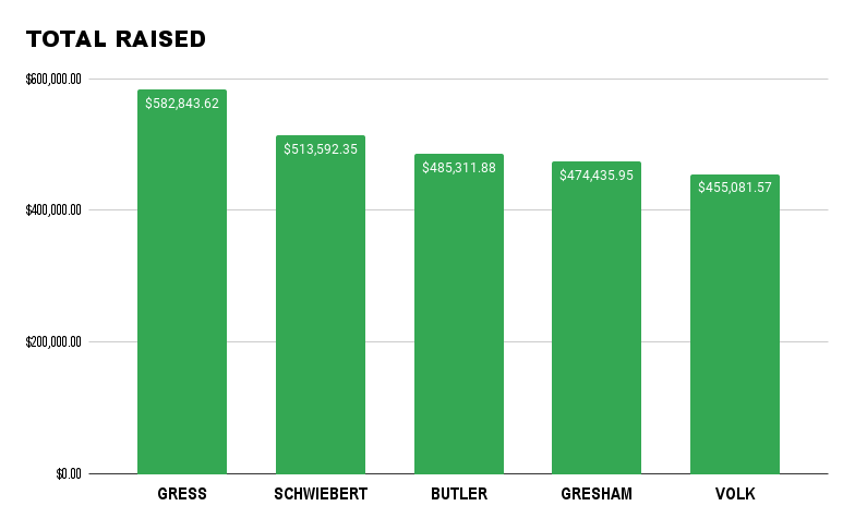 And former Democratic lawmaker Kelli Butler and her running mate, Karen Gresham, who are facing Gress in the race for two House seats in Legislative District 4, are close behind, with each raking in nearly a half-million as of the end of the reporting period.